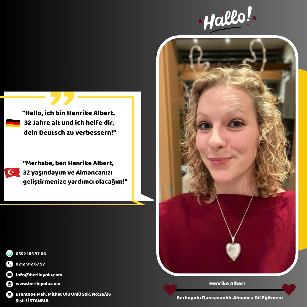 Henrike Albert, 32Jahre alt Ausbildung: Bachelor of Education, Studium der Sozialen Arbeit, ausgebildete Sprachlernbegleiterin für Deutsch als Fremdsprache Henrike: „Ich liebe meine Sprache und unterrichte gern. Daher ich weiß auch, wie schwer das Lernen manchmal sein kann. Gerne unterstütze ich dich mit meinem Deutschtraining, verbessere deine Aussprache und helfe dir deine Sprachtests gut zu bestehen. Wir treffen uns in Kleingruppen oder zum Einzelunterricht via Zoom. Manchmal ist meine Hündin Lola auch dabei. Wir freuen uns, dich kennenzulernen